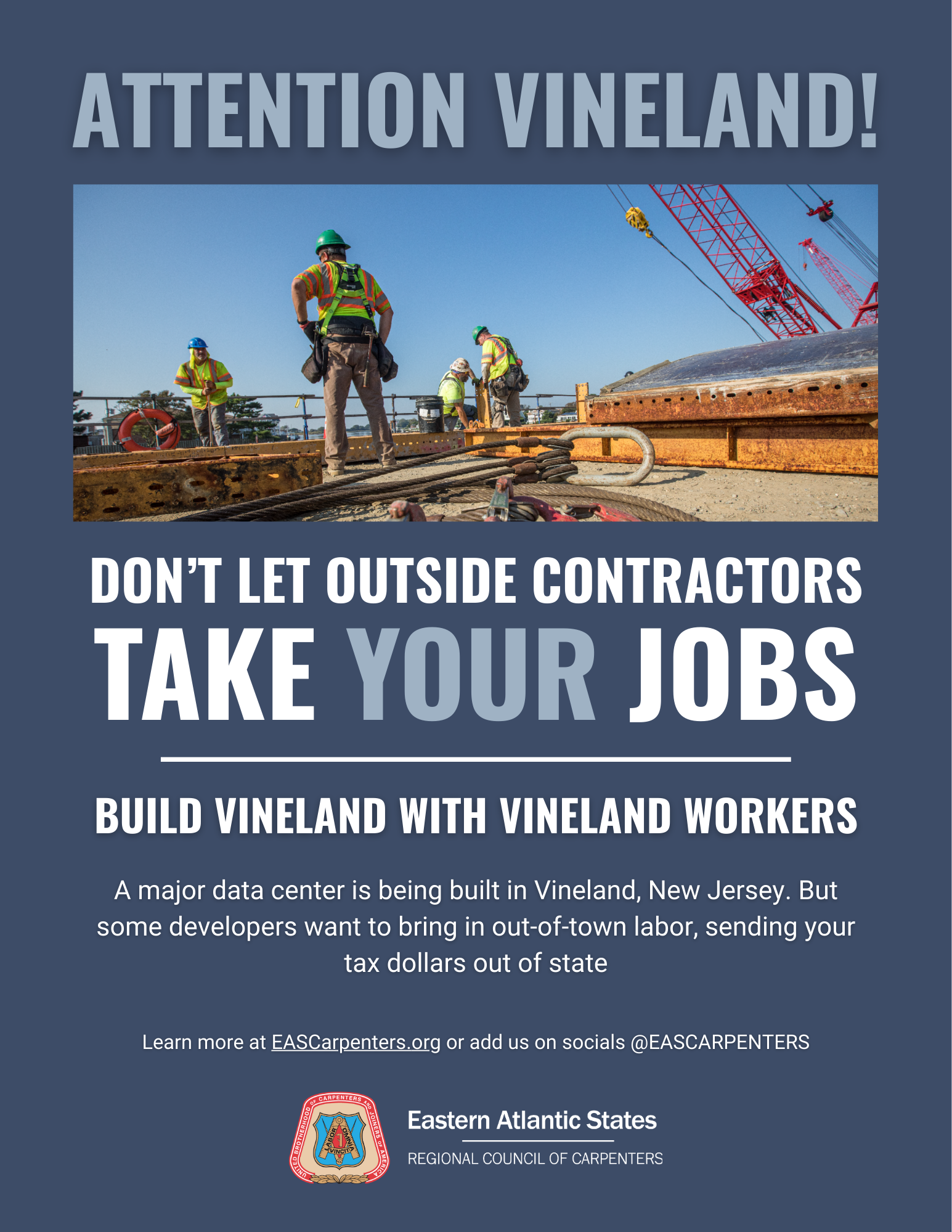 Through community outreach and a letter to the editor in the local paper, the Vineland Voice, EAS Carpenters made it clear that big projects should benefit South Jersey families.